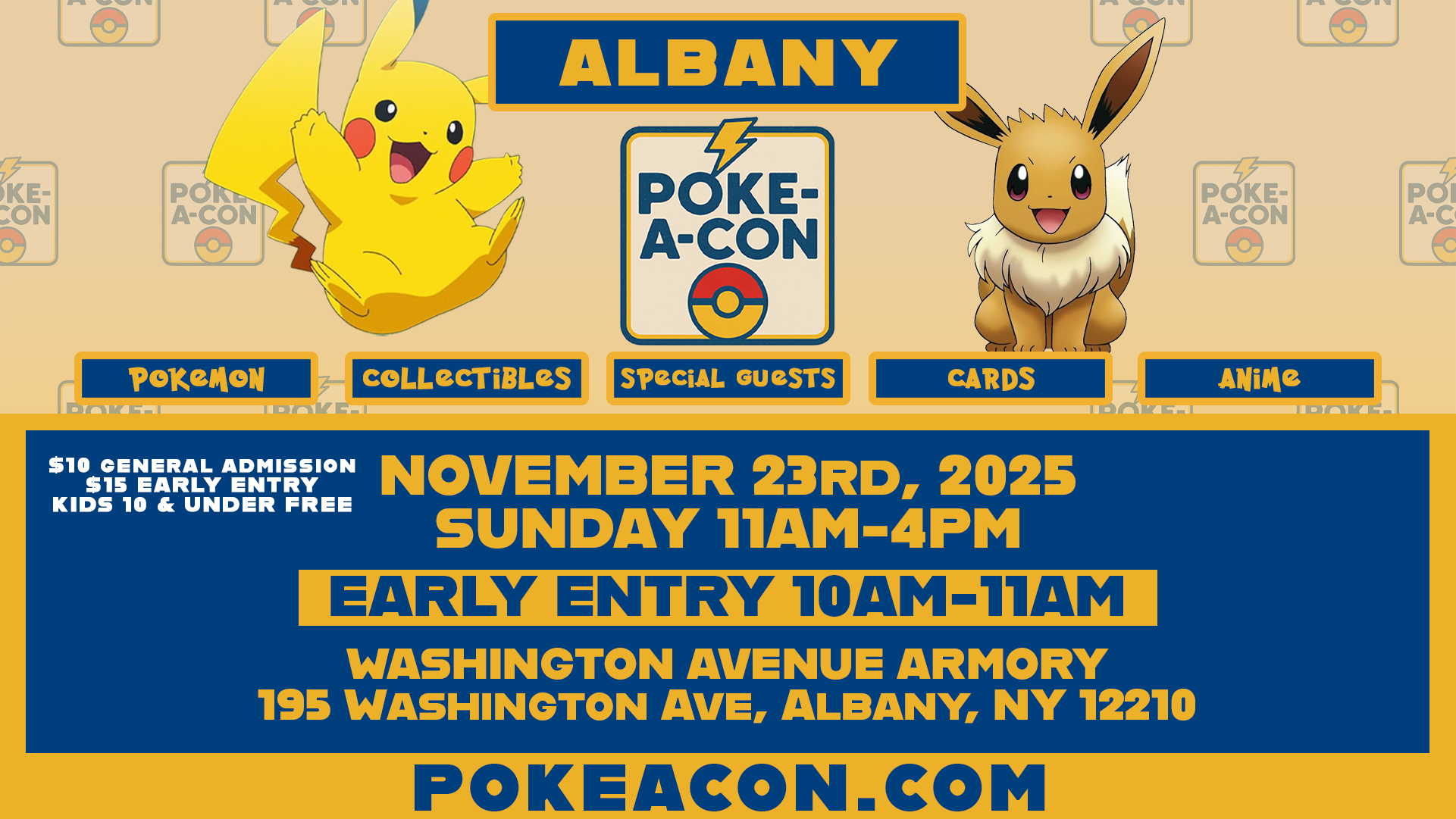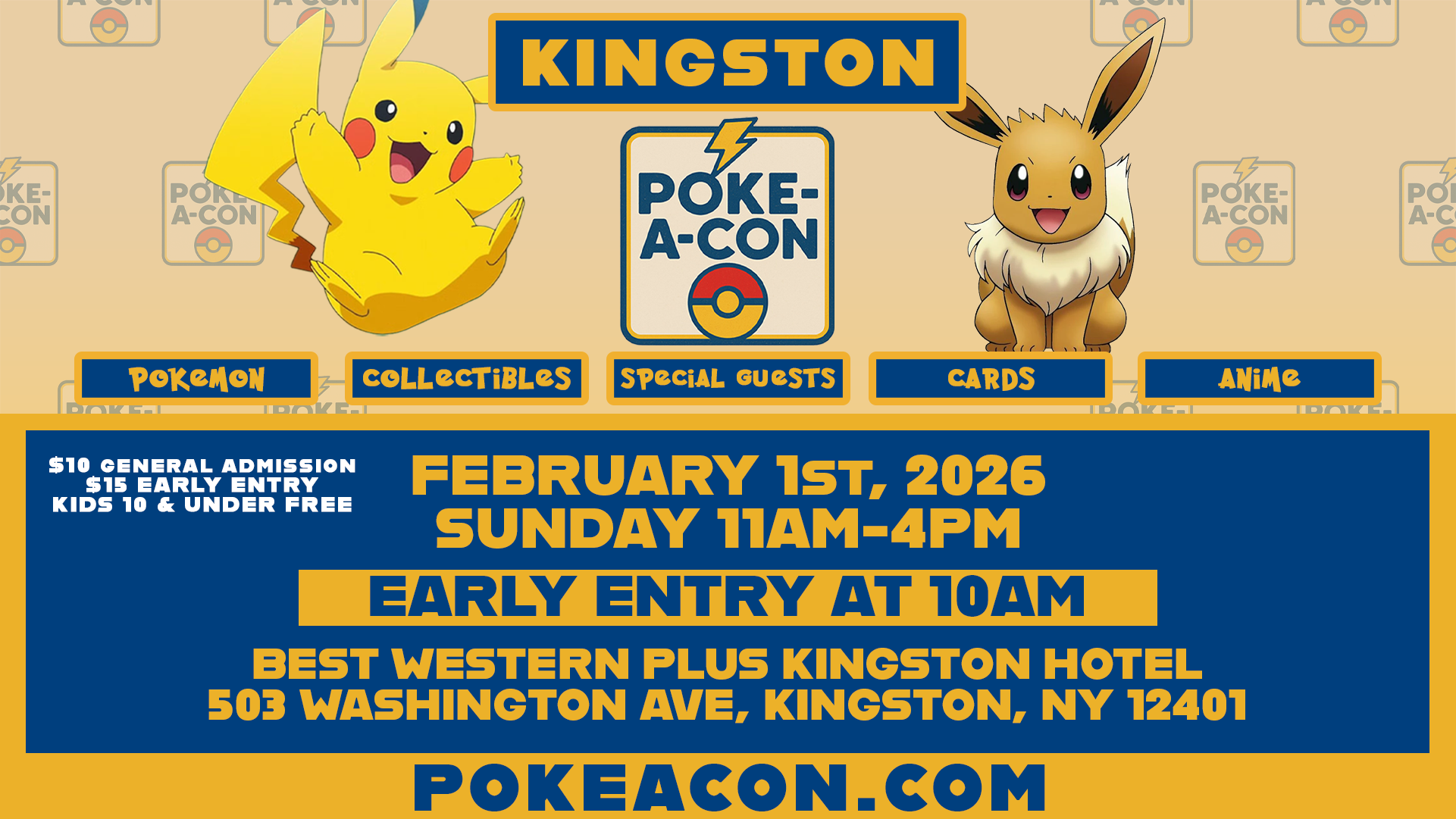 Join us Sunday, February 1st at the Best Western Plus Kingston Hotel for an unforgettable day of Pokémon fun! Explore a wide variety of vendors selling cards and collectibles, trade with fellow fans, meet special guests, and take photos with Pikachu & Eevee — all under one roof! Perfect for families, collectors, and Pokémon fans of all ages.