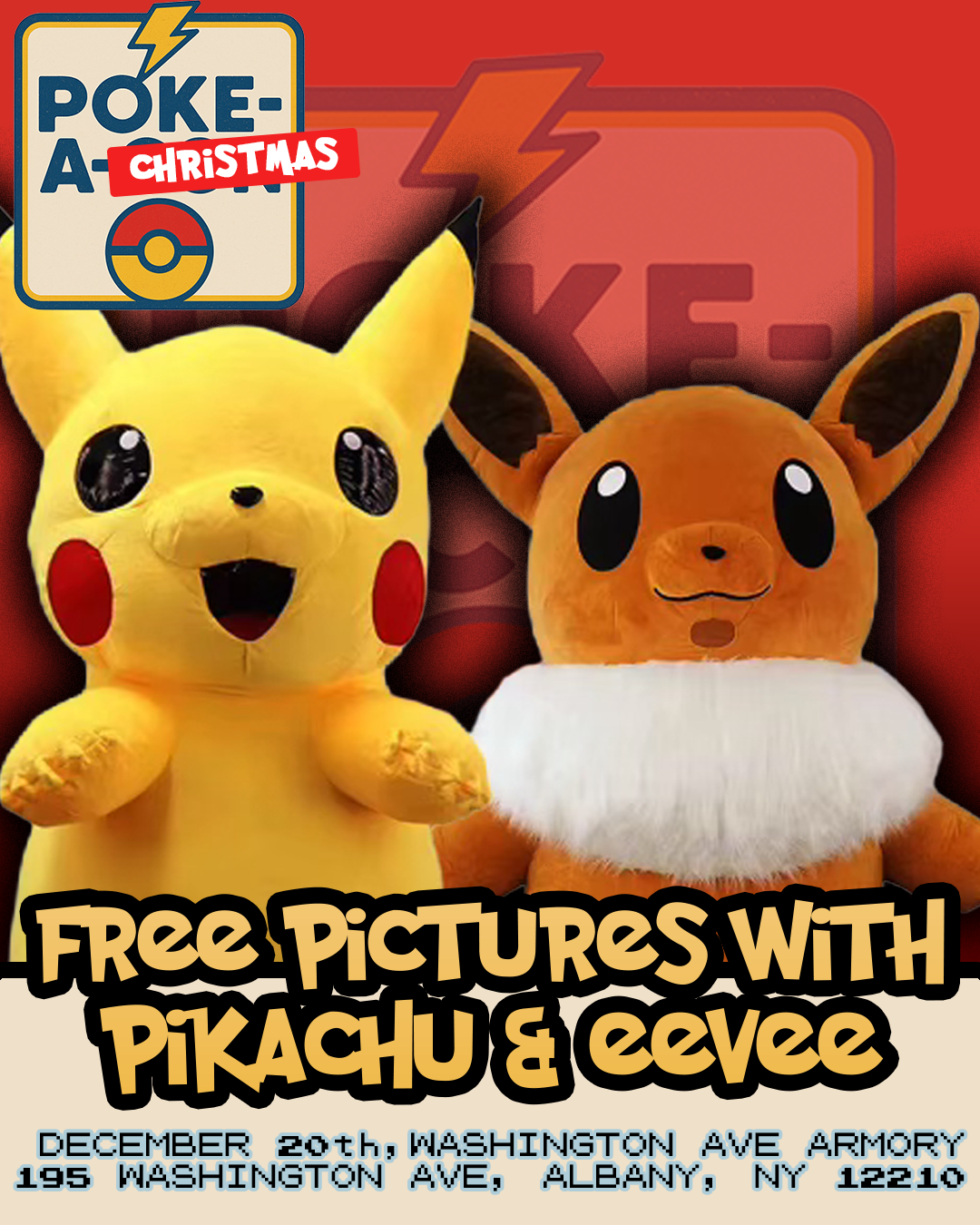 Pikachu and Eevee are joining Poke-A-Christmas 2025 for free photo opportunities throughout the day. Bring your friends and family to snap a picture with two of the most iconic Pokémon — the perfect way to remember your day at Albany’s ultimate trading card show!